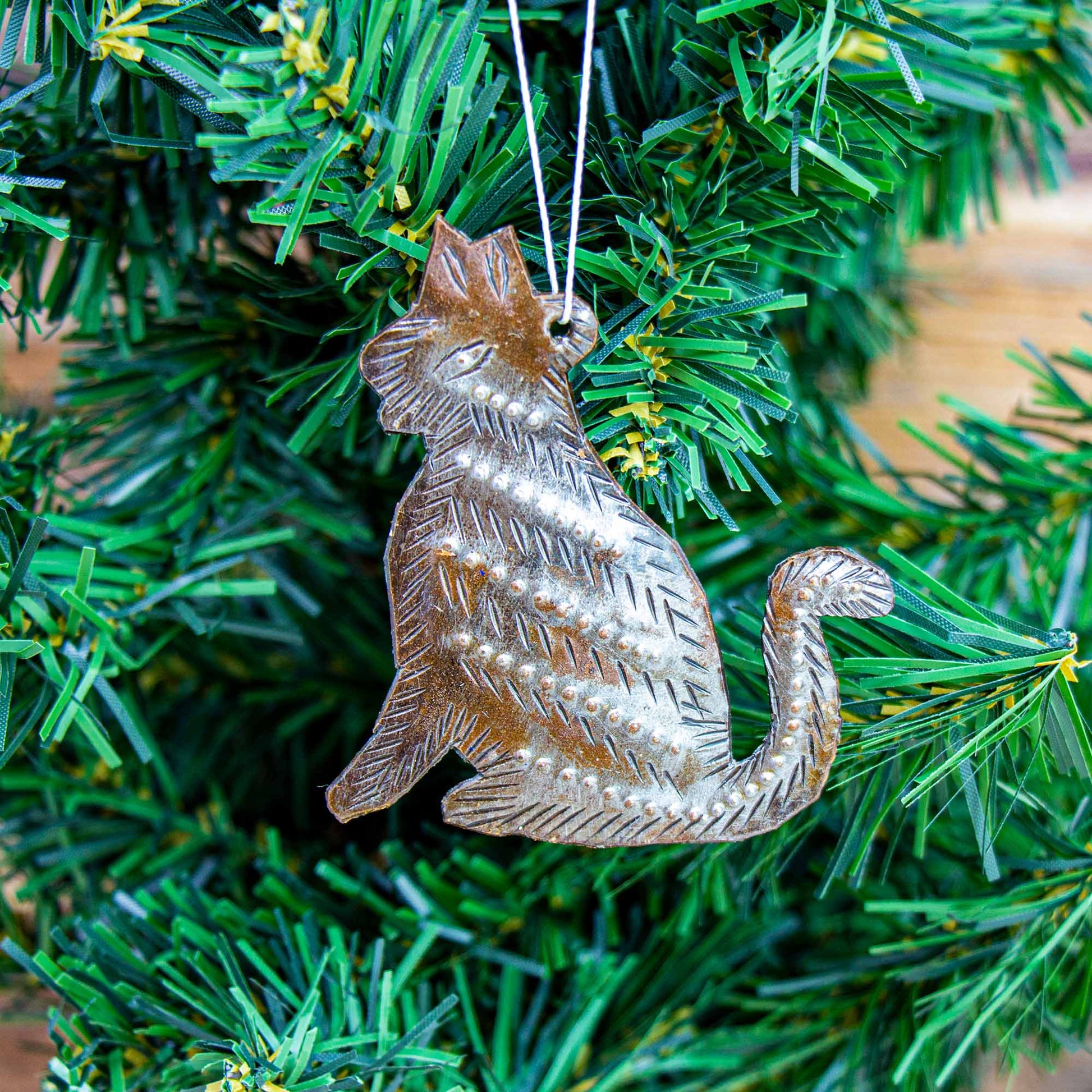 This ornament is handmade in Haiti from scrap steel oil drums. Hand-crafted from recycled 55-gallon steel drums by village artisans in Haiti; treasures that are truly one-of-a-kind! Each ornament has a loop for hanging on a tree. Perfect for the cat lovers!