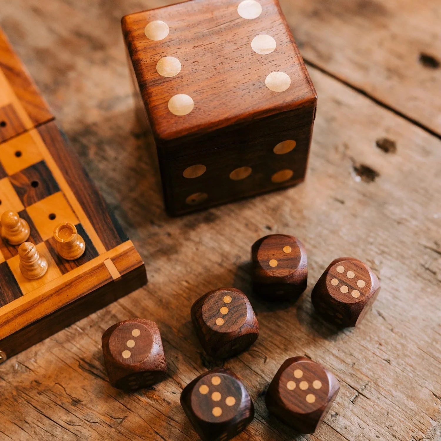 This small wooden box is hand-carved from Indian Rosewood and shaped and made to look like a large die containing five small wooden dice with gold painted dots