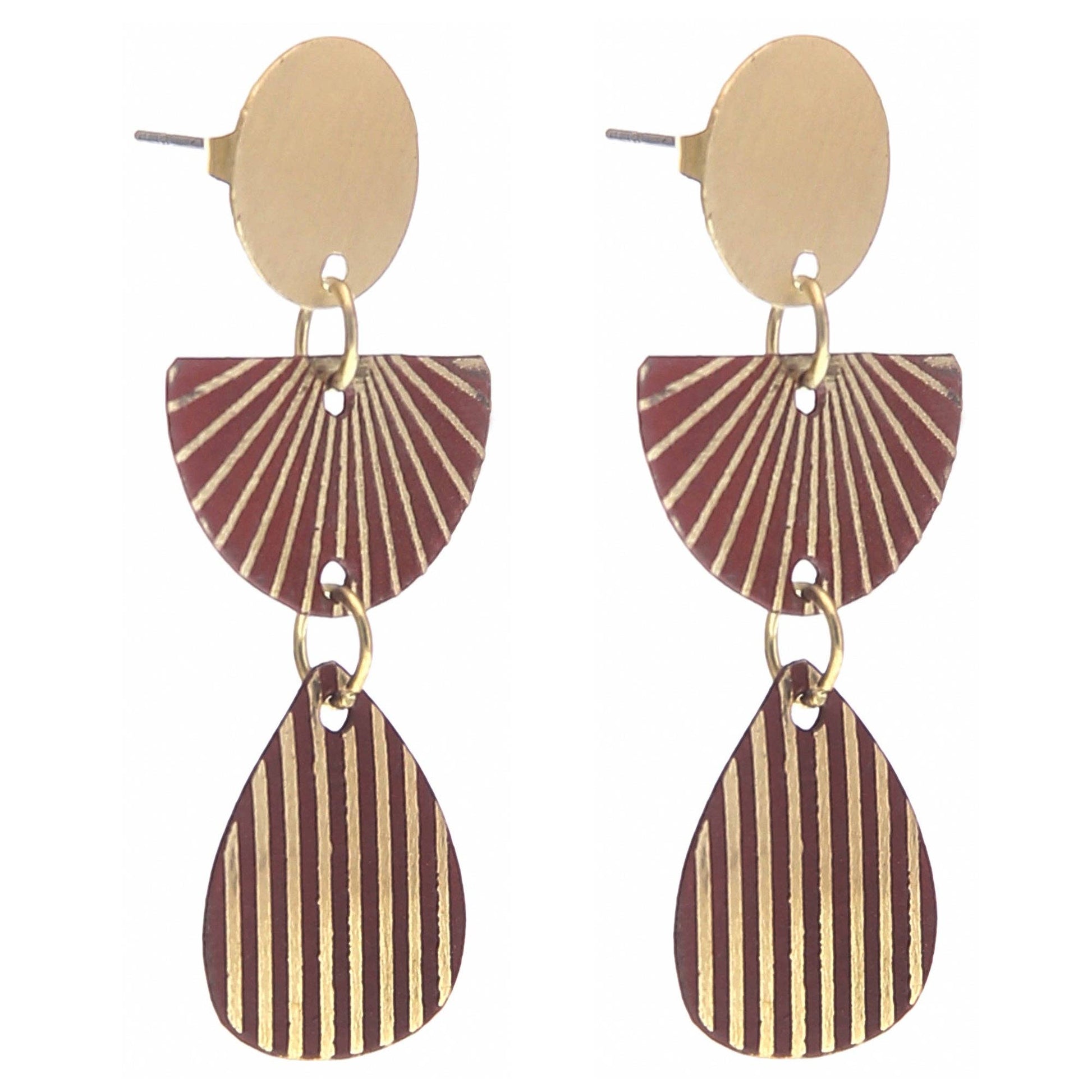 Handcrafted brass earrings featuring a rich patina finish, accented with organic brown and shimmering gold lines. A perfect blend of rustic charm and subtle elegance