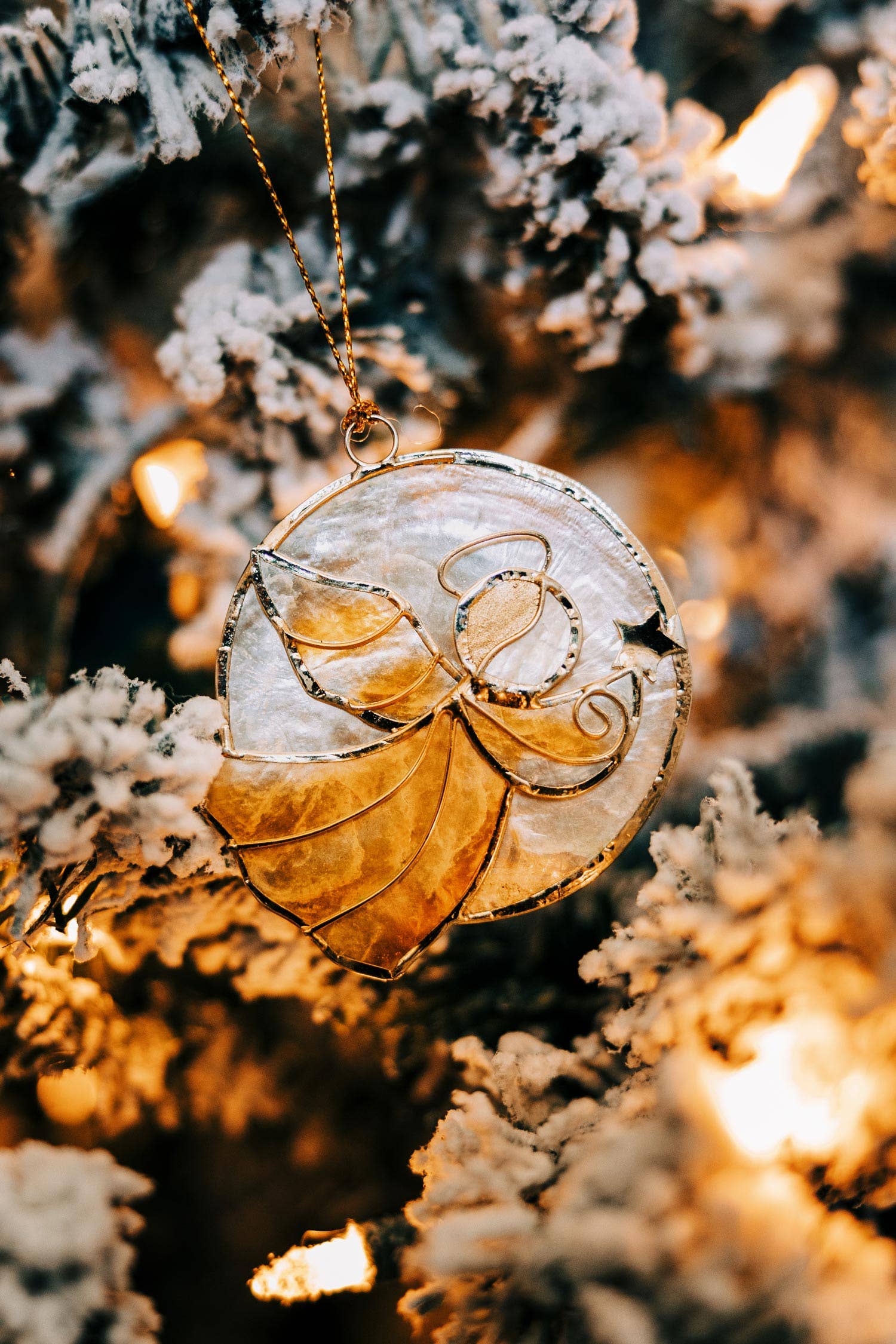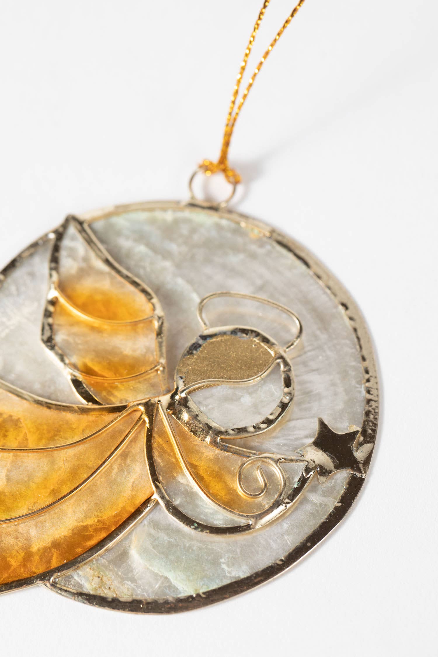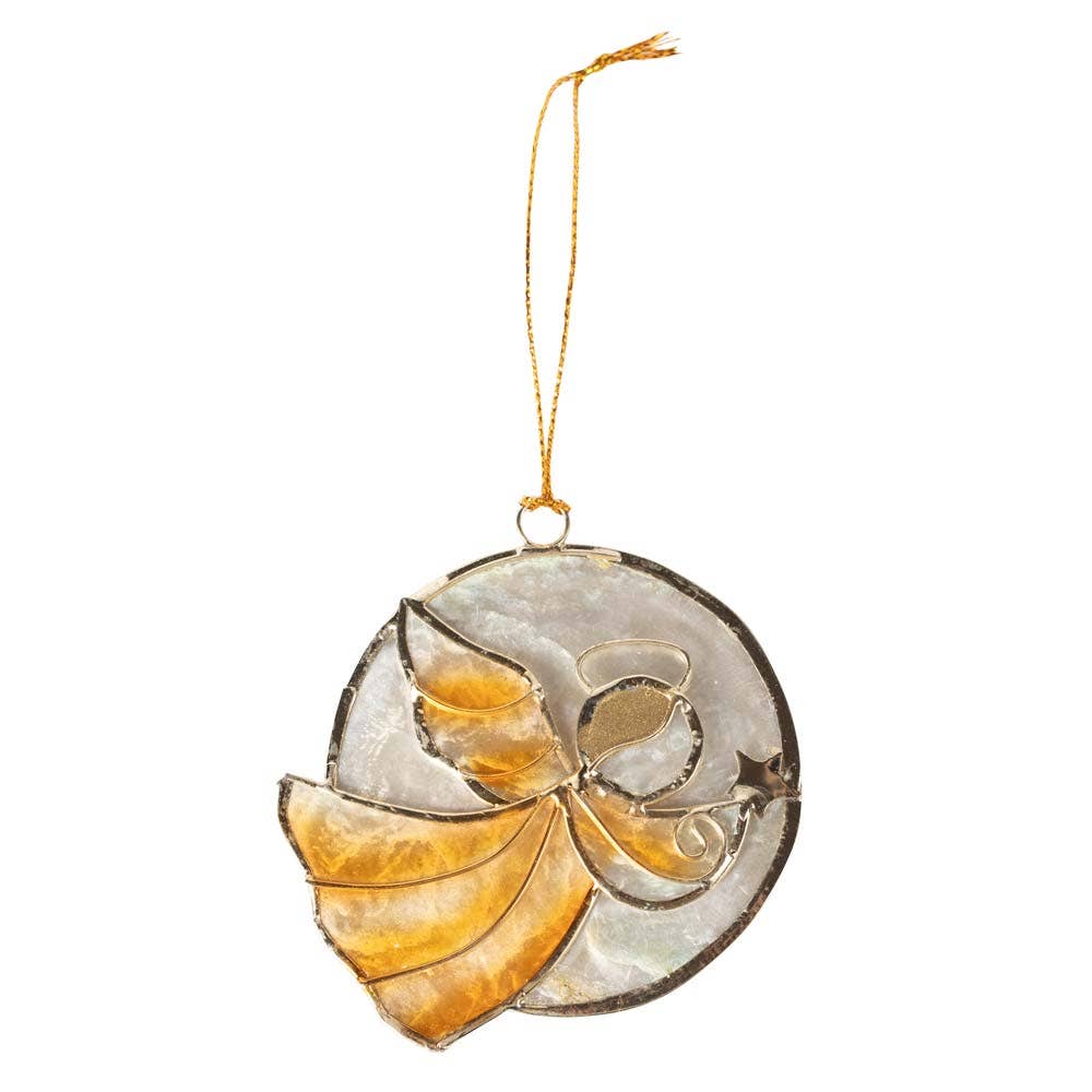 Heralding peace on earth in the night sky, the Golden Angel Capiz Ornament is handcrafted of one of the Philippines' natural resources: capiz shell. Due to the way the light filters through the thin shell, this ornament glows beautifully on a Christmas tree or in a window.