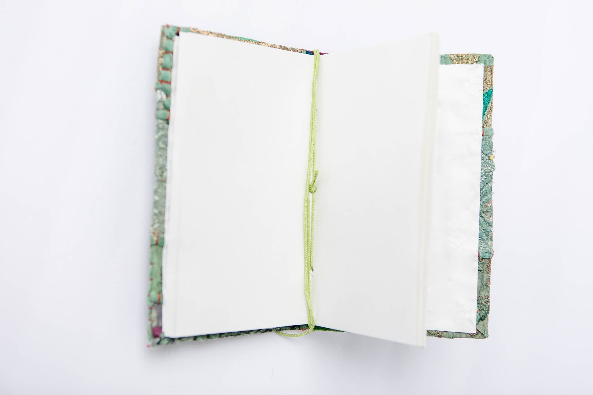 Experience the unique charm of our Green Patchwork Journals, handcrafted with up-cycled sari fabric and sustainable paper. Each journal features a one-of-a-kind patchwork design, making every piece truly distinct. The unlined paper offers endless possibilities for creativity and expression. Made by skilled artisans in the culturally rich Rajasthan region of India, the vibrant colors and intricate patterns are sure to inspire artists and writers alike. Our handicraft partner has been a proud member of Fair-Trade for over three decades. Measures 8"H x 5.25"W.