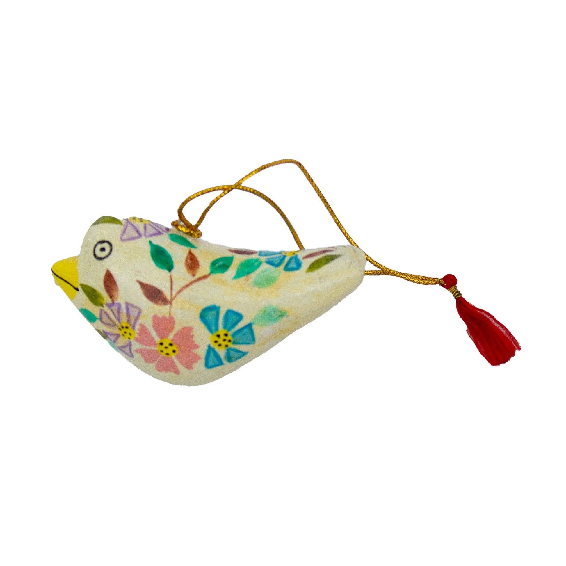 Handcrafted in the Kashmiri region of India with a traditional papier-mâché technique, these beautiful hand-painted bird ornaments celebrate the season with elegant designs. Each is a small piece of art and perfect for the garden or bird enthusiast. The creation of one piece takes several days and begins with a handmade wooden mold. Recycled paper is used to make the pulp and applied to the mold. Once the form is smooth and dried, it's taken to the workshop for artisans to paint.
