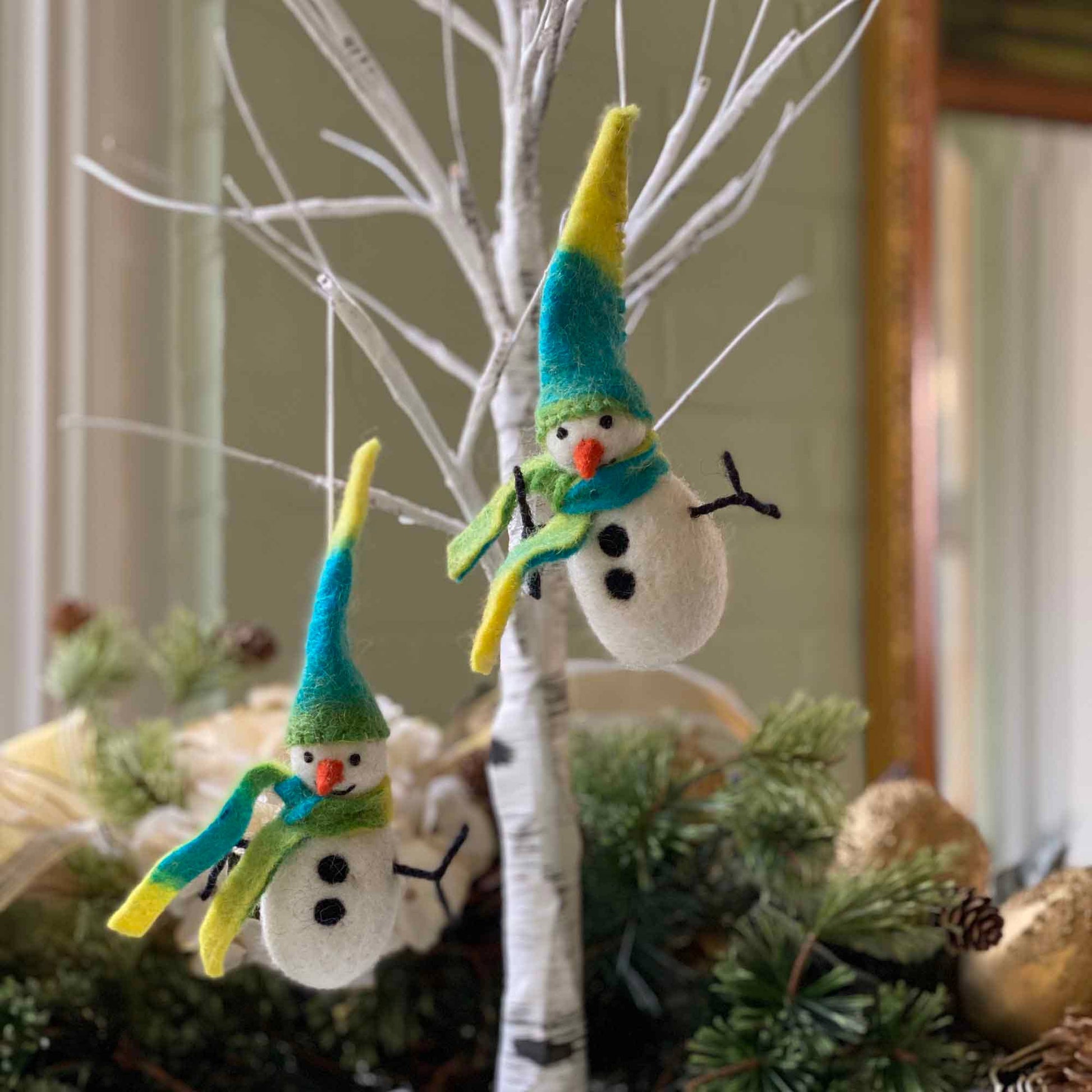 Our traditional Nordic snowman boasts the cooling color palette of a truly icy day! He is carefully hand crafted of Eco-friendly wool felt by women artisans in Nepal . Azo-free dye. Fair trade, measures 7.5" x 3".