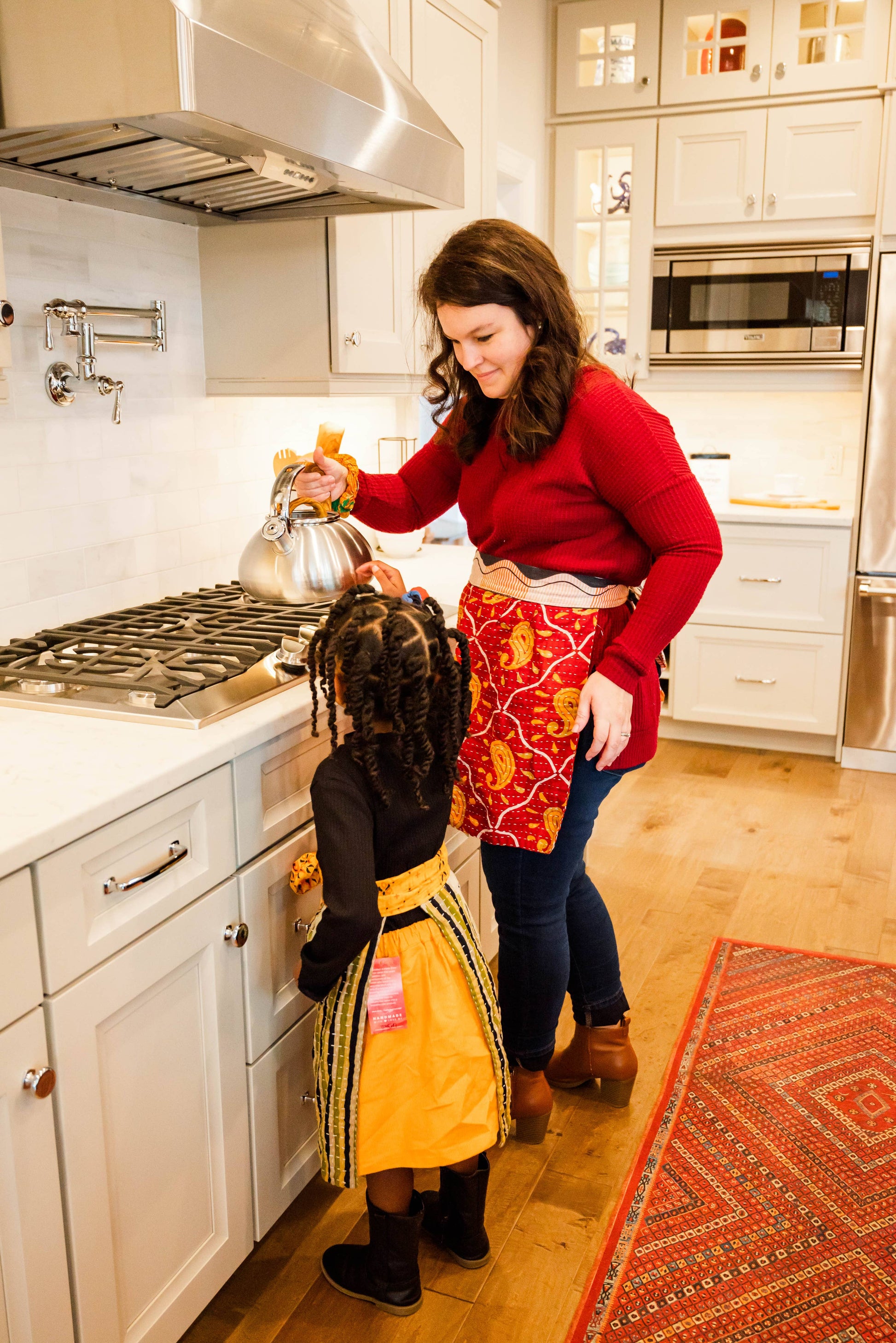 Add a touch of handmade elegance to your kitchen with our Kantha Apron! Inspired by the beautiful hand stitching of our Kantha Kitchen Towels, this apron is crafted with the same vibrant colors and traditional kantha. It’s designed to fit comfortably around any waist, with pleating for a flattering shape and a matching fabric waistband that ties into a beautiful fluffy bow in the back. Made from recycled saree material, each apron is unique, combining both style and sustainability. Whether you're cooking, baking, or hosting, this apron adds a functional and charming touch to your kitchen routine.