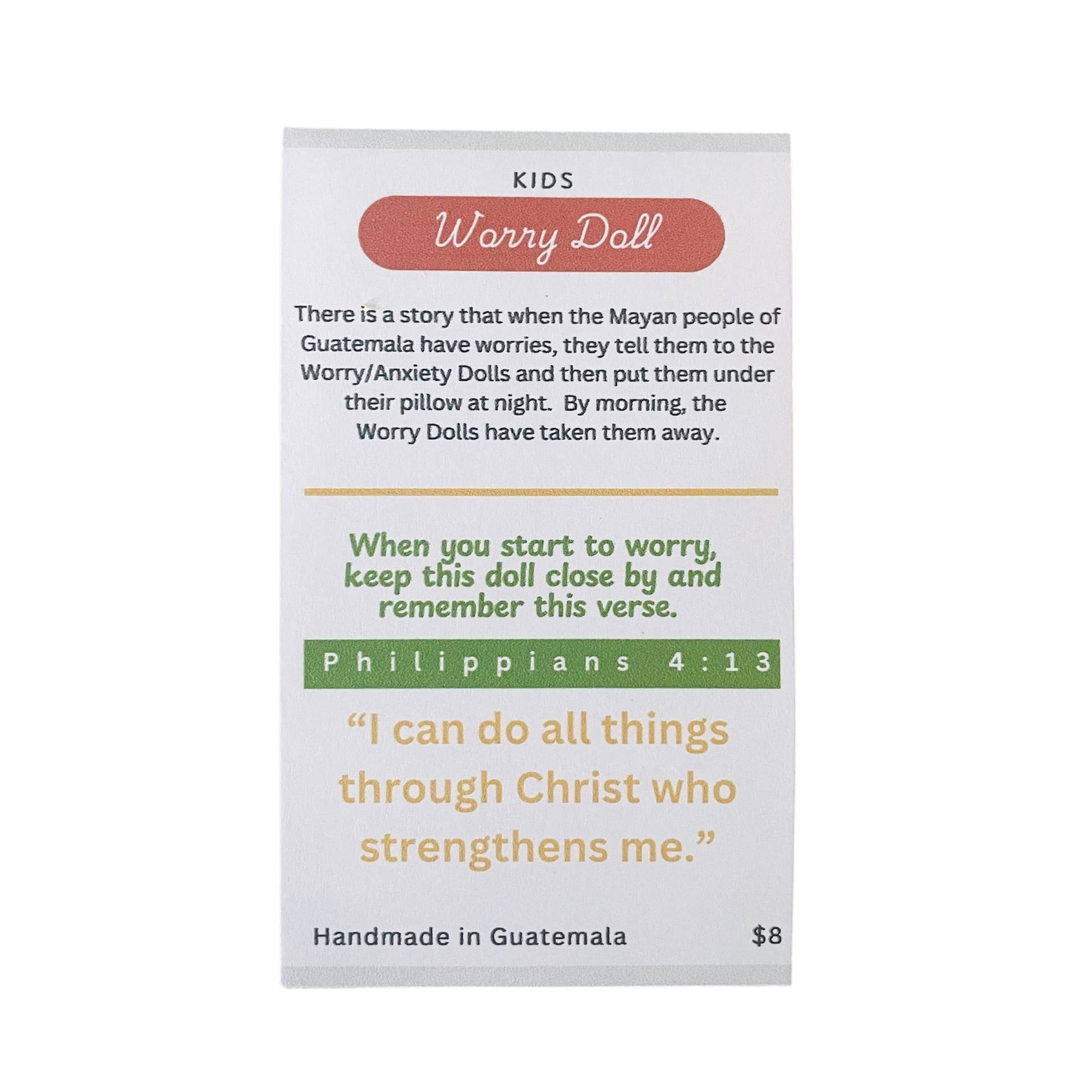 Handmade in Guatemala. Each purchase supports the artisan who handcrafted the piece. Each doll comes in a poly bag and info card. These are handmade items so each one is similar but not exact.