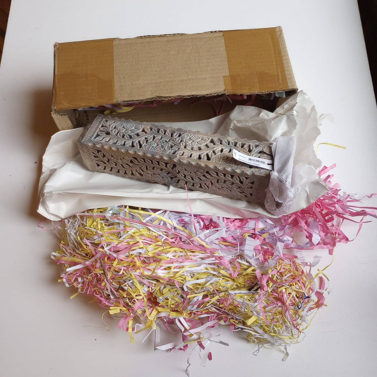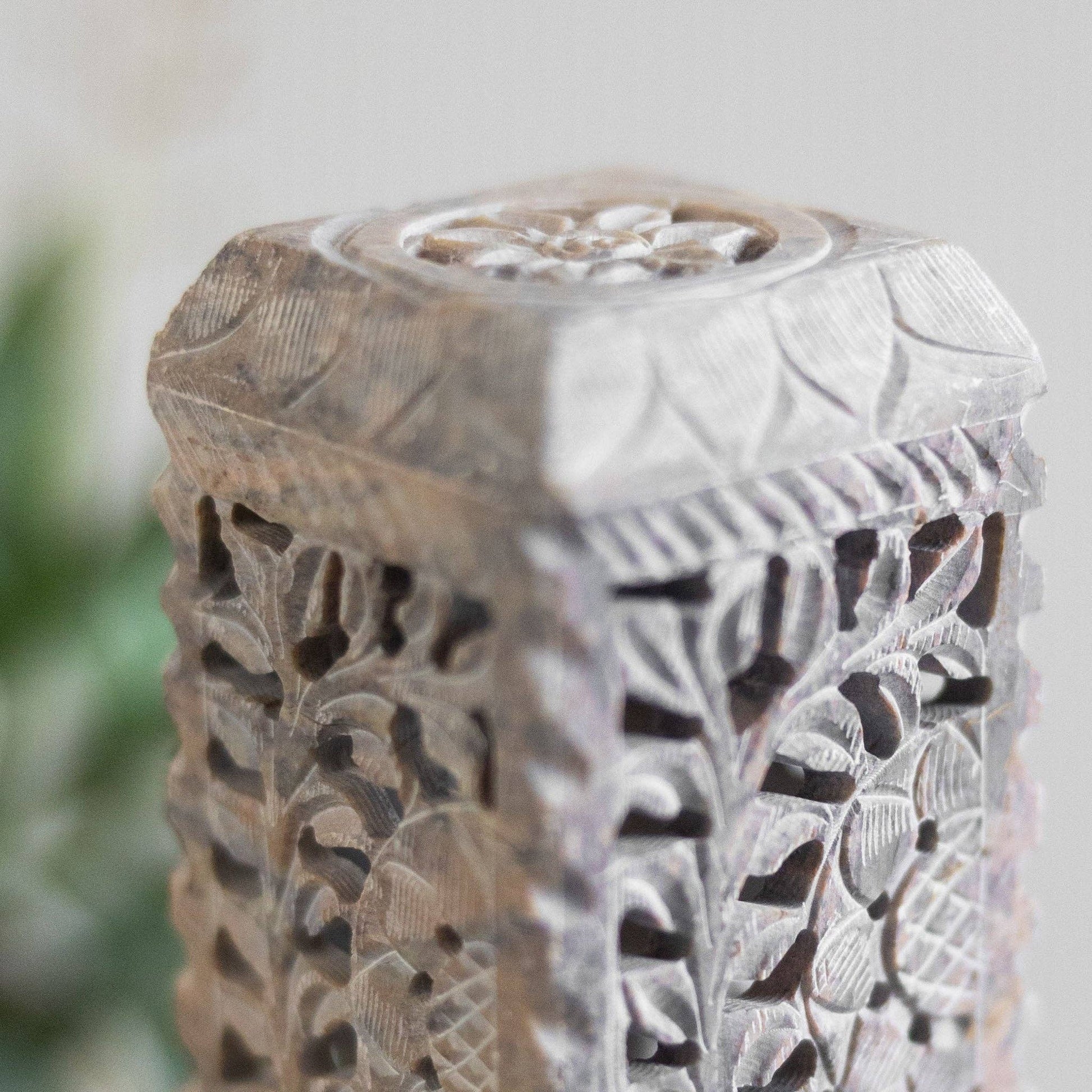 This handcrafted Meenaar Gorara Stone Tower Incense Holder unites beauty and function. Featuring stunning jali work, a staple of Indian architecture, in an intricate floral and vine pattern on the removable tower. Inside the base are small holes to hold your incense of choice. Makes a wonderful gift for the hostess or anyone who could benefit from a sense of calm! Handmade by artisans with Asha, which means hope, in India.