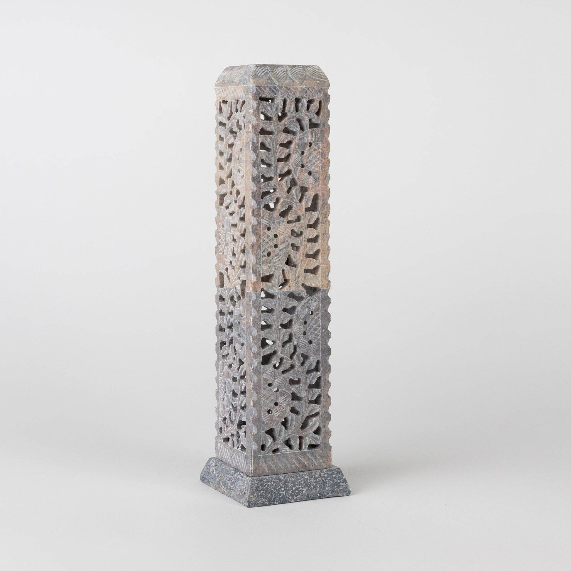 Materials: Gorara stone - Measures: 2.75"SQ, 10.5"H - Colors: Natural, pink, peach, gray - Note: Stone color may vary - Warning: Do not leave incense burning unattended. Use with proper ventilation. - Barcode: 732919546200 - Handcrafted in India