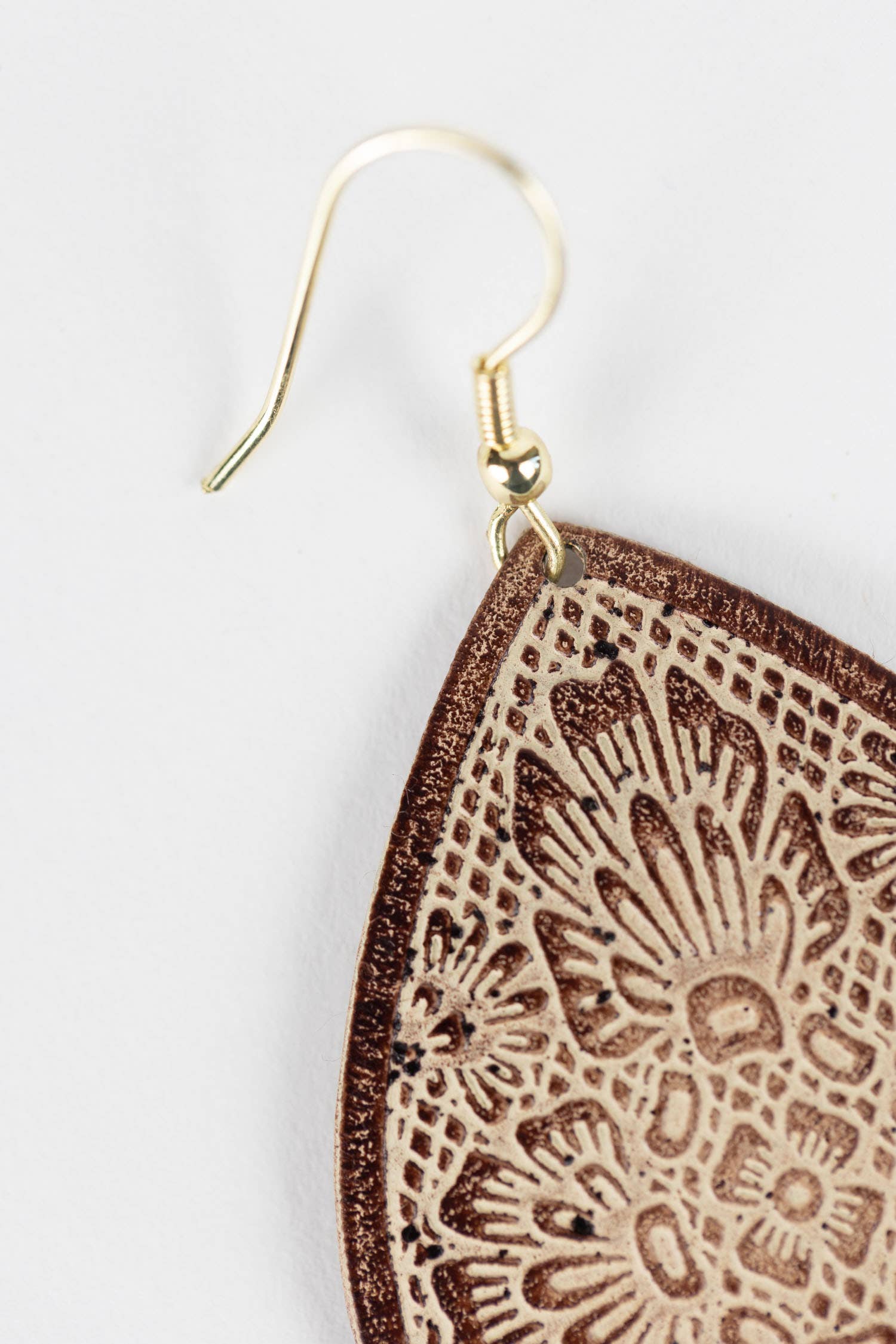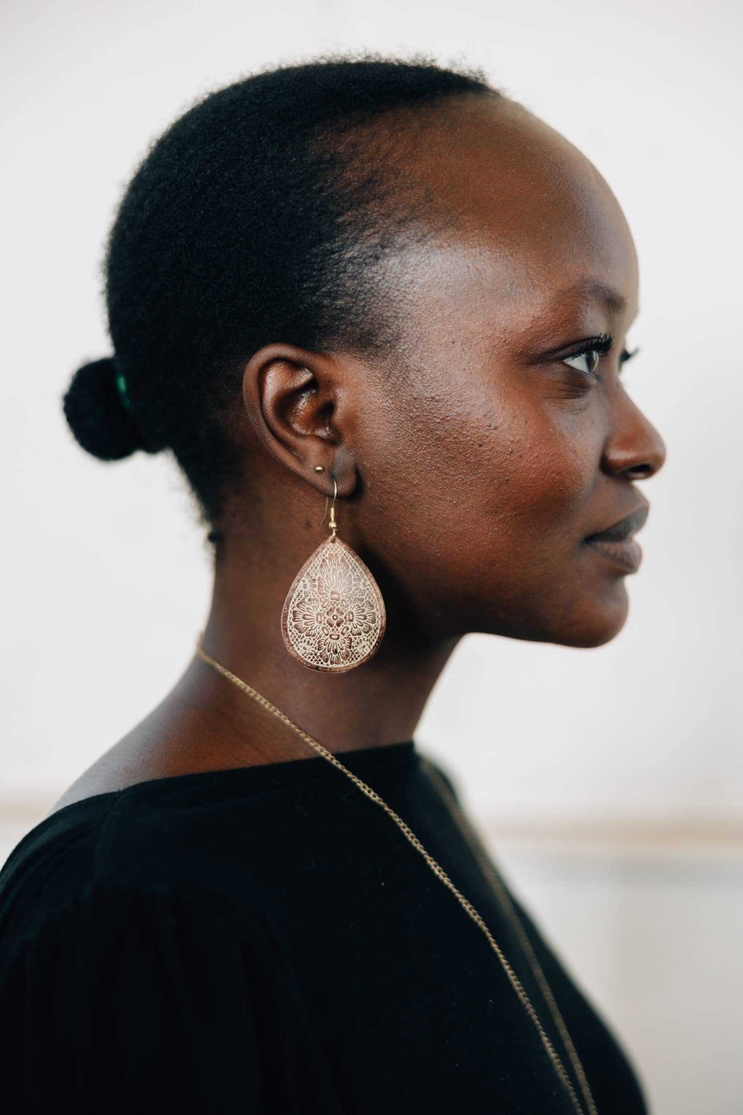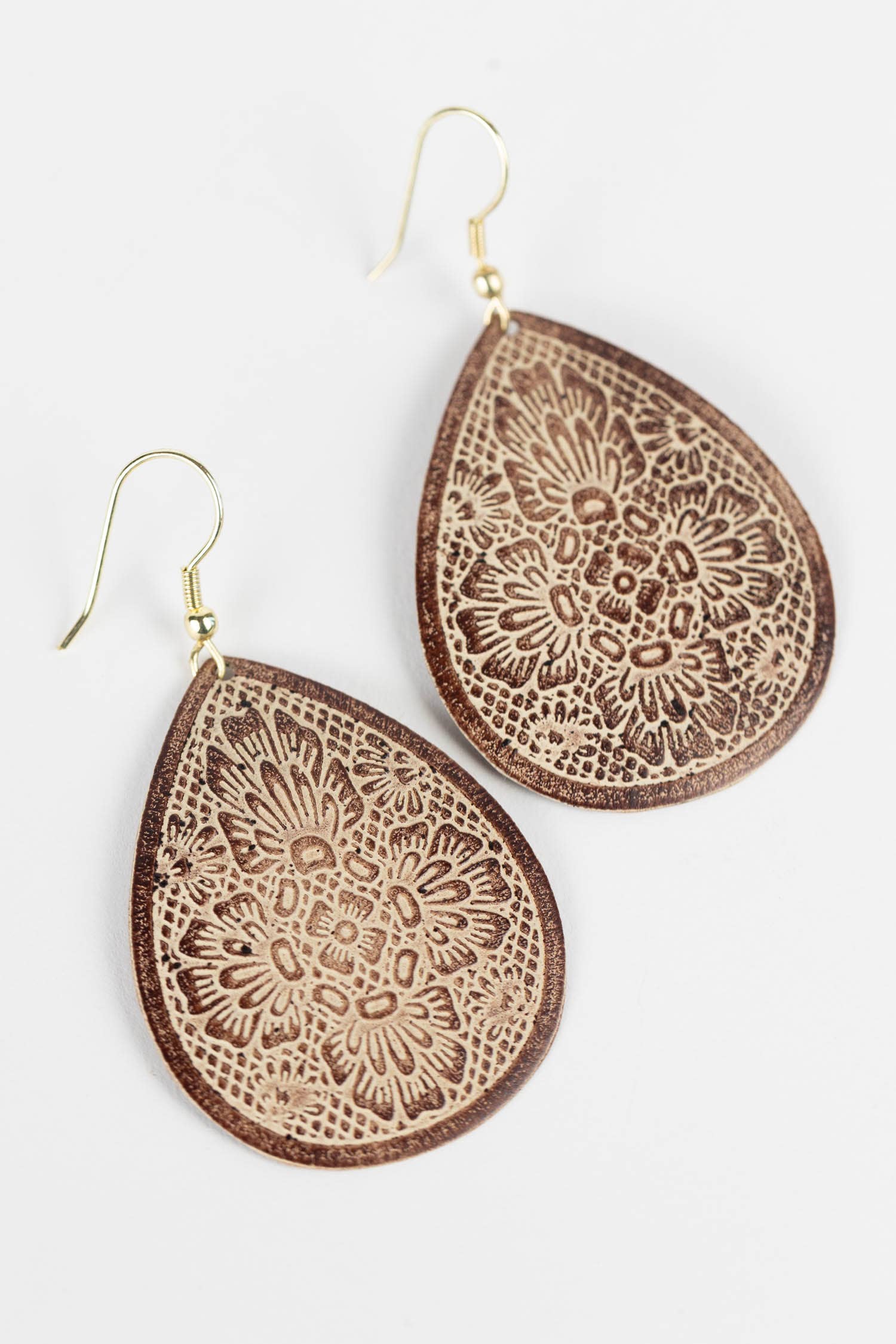The Regal Teardrop Earrings are embossed with a delicate flower design, adding a touch of sophistication and elegance to any outfit. The slightly curved shape of these brown brass patina earrings, complements the natural curves of your face, creating a flattering, feminine look. Whether you're dressing up for a special occasion or adding a touch of elegance to your everyday look. Ethically handcrafted in small batches by artisans in India with TARA Projects, working with hundreds of artisans: paying fair wages, providing medical insurance, interest‒free loans and advances, a savings program, and skills training.
