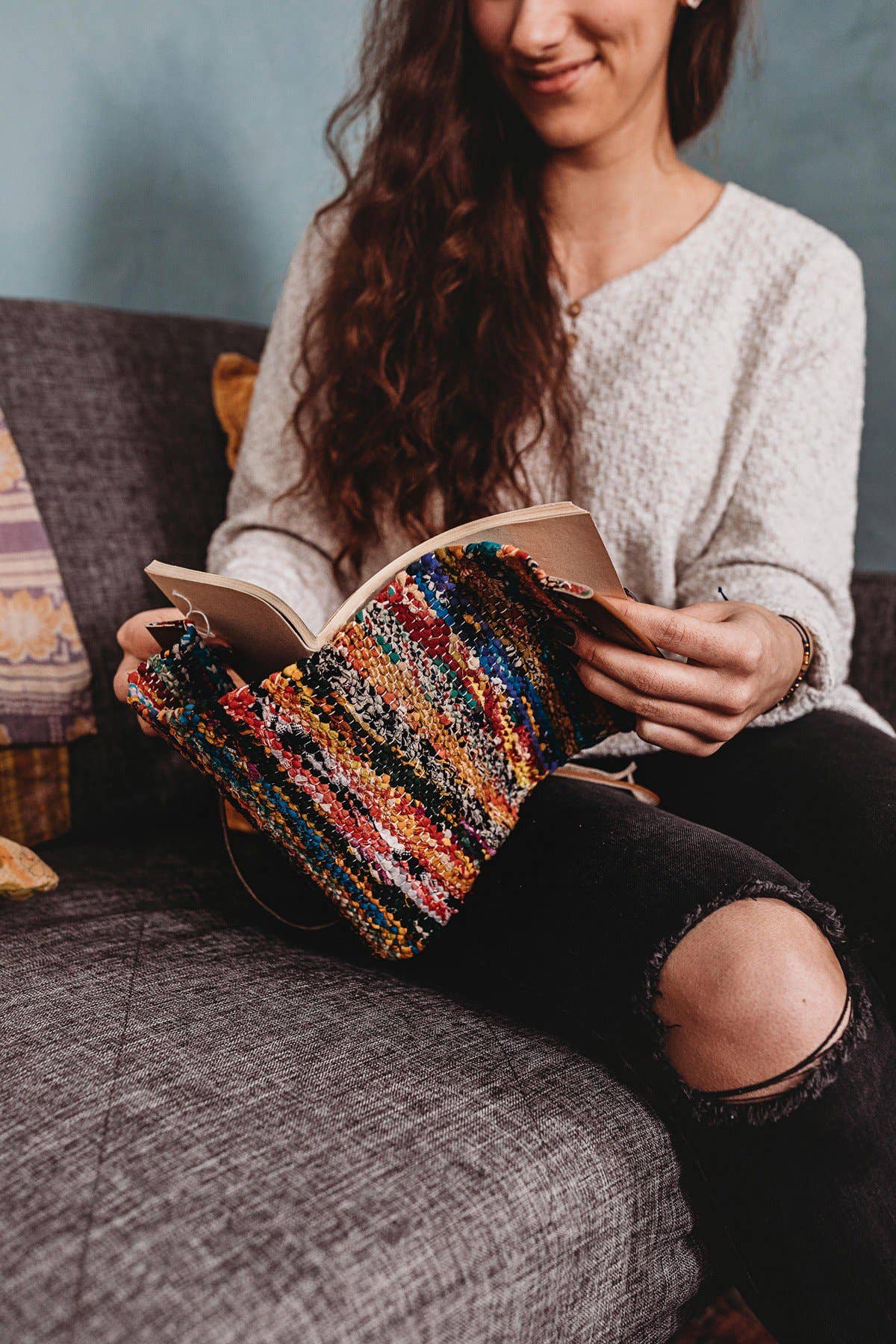 May your adventures be as colorful as the book where you record them! Containing 50 pages of handmade paper, with a cover woven from recycled sari cloth, this journal was handcrafted by the women of Biborton Handmade Paper, a workshop of our artisan partner Prokritee in Bangladesh. Employment with Biborton provides the women sustainable income to secure proper housing, adequate food and education for their children. Handmade paper journal with woven recycled sari cover and leather trim - 50 pages - 8.5Hx6W inches - Assorted colors and patterns; each is unique. - Handmade in Bangladesh