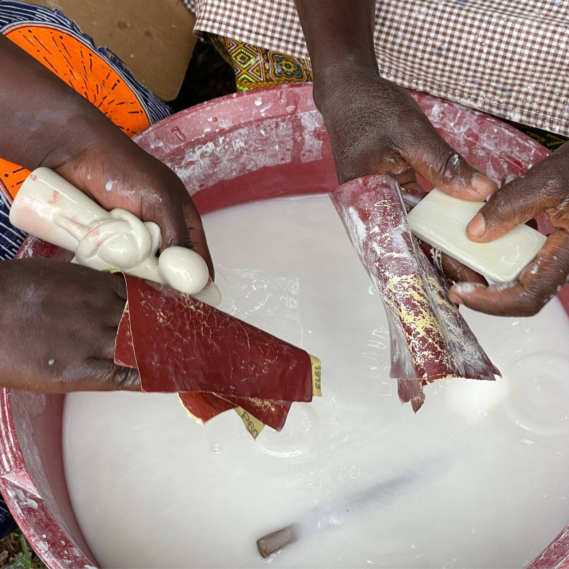 Hand-carved from a single piece of Kisii soapstone by African artisans, this sculpture features an angel with a sheep in her arms. The sweet angel with her sheep represents innocence. Carved images of lambs may vary in shape and size, based on the artisan who has created the sculpture. Expect some variance in designs, which speaks to the handmade nature of each piece. Product Features: * Measures approximately 5-inches tall by 3-inches wide. Due to the hand-carved nature, exact size may vary. * Color variations will range from cream to pink to gray to earthy gold in any single piece due to the nuances of natural stone. * Soapstone is a soft stone, making it ideal for carving into many forms.