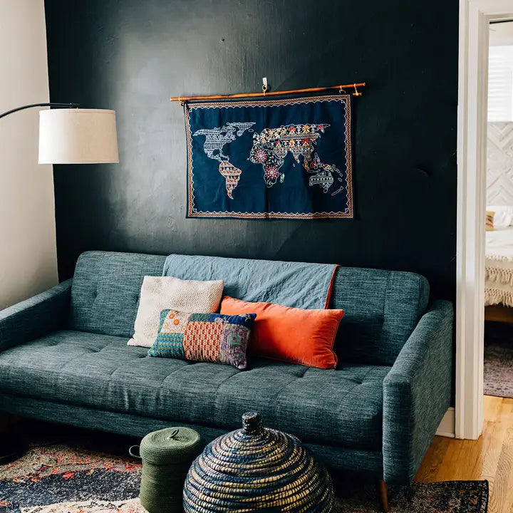 It’s a wonderful world ... and colorful, too! The Wonderful World Wall Hanging Map is hand-embroidered by artisans with our fair trade partner St. Mary’s Mahila Shikshan Kendra using the Kathiawad technique which accents embroidery with small mirrors. Founded by the Dominican Sisters following the closure of textile mills in the area, St. Mary’s has provided job opportunities for local women for over 40 years. The income women earn has helped to educate a generation of children, many of whom have become the first in their families to attend college. Embroidered cotton wall hanging with mirror accents - Background is navy blue; embroidery is multi-colored - 36Wx24H inches - Includes 3-inch channel on top edge of back - Handmade in India